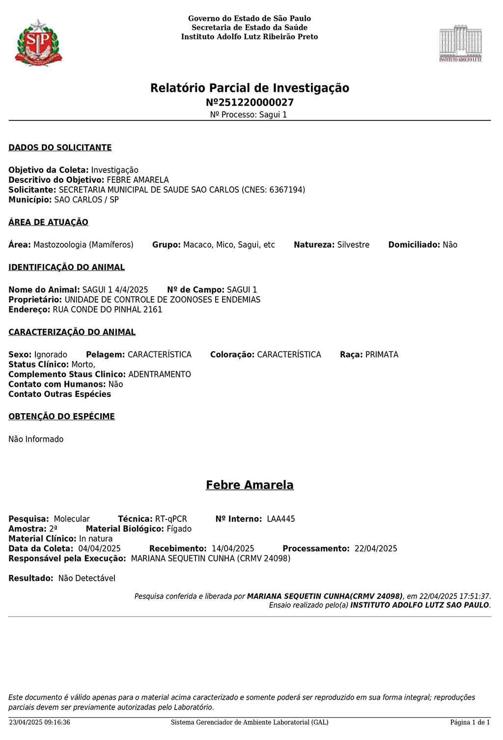 O animal, um sagui, foi coletado em 4 de abril e teve o exame processado ontem, dia 22. De acordo com o relatório parcial de investigação, o espécime era silvestre, não domiciliado, e foi encaminhado ao Instituto por meio da Unidade de Controle de Zoonoses e Endemias. O resultado do teste foi assinado pela médica veterinária Mariana Sequetin Cunha (CRMV 24098).