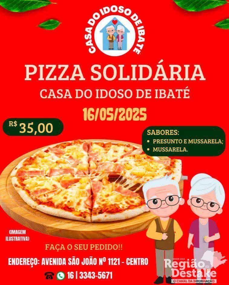 A Casa do Idoso de Ibaté realiza nesta sexta-feira, 16 de maio de 2025, mais uma edição da “Pizza Solidária”, uma iniciativa beneficente que visa arrecadar recursos para a manutenção da entidade. Cada pizza custa R$ 35 e pode ser encomendada nos sabores presunto com mussarela ou apenas mussarela.