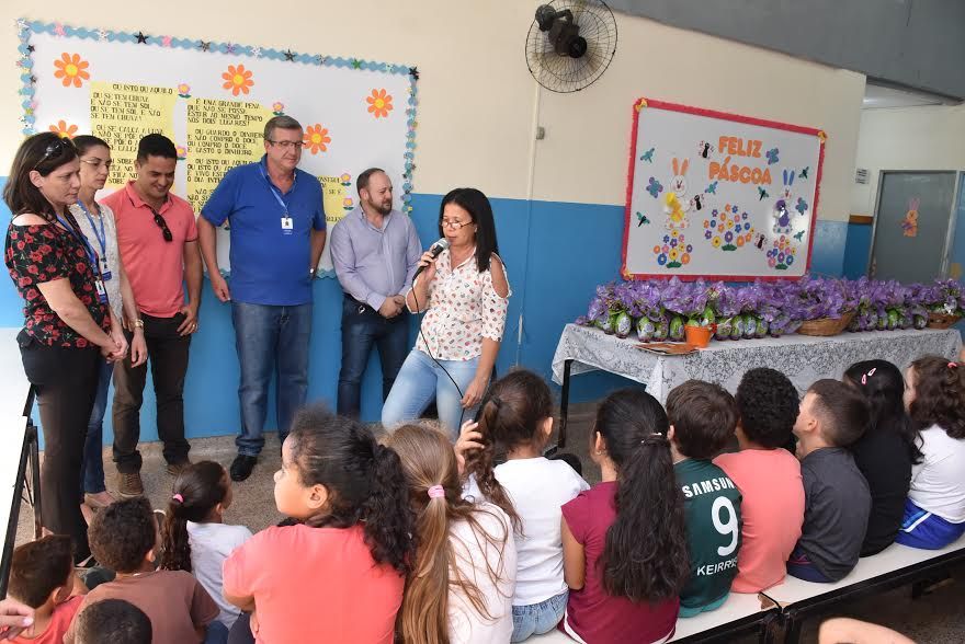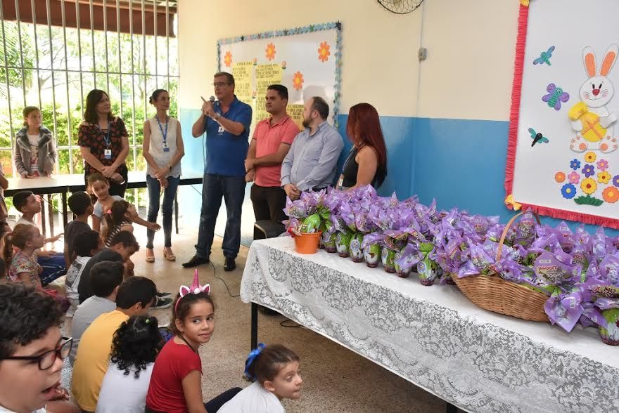 Durante a manhã, os secretários de Educação, Nino Mengatti, e de Agricultura e Abastecimento, Deonir Tofollo, estiveram na EMEB Maria Ermantina Carvalho Tarpani para fazer a entrega dos ovos de chocolate para 276 estudantes.
