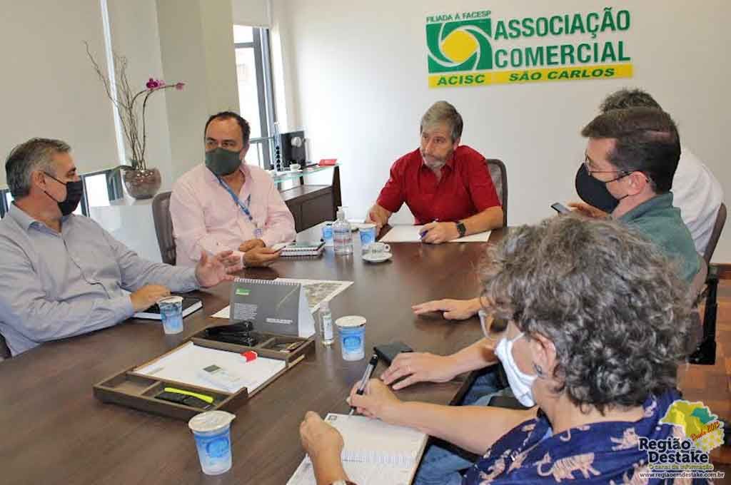 O presidente da ACISC (Associação Comercial e Industrial de São Carlos), José Fernando Domingues, o Zelão, juntamente com os diretores, Mozart Pedroso, Renato Batista e Lídia Maria Mendes, e o gerente executivo, Alexandre Rosa, se reuniram com os secretários municipais de Transporte e Trânsito, Obras Públicas, e Habitação e Desenvolvimento Urbano, Paulo Sérgio Luciano, João Muller e Wilson Jorge Marques, respectivamente, para falar sobre as obras e projetos que envolvem a região comercial de São Carlos.