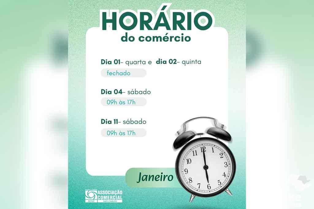 A Associação Comercial e Industrial de São Carlos (ACISC) anunciou os horários de funcionamento do comércio para o mês de janeiro de 2025. A definição dos horários foi estabelecida em conjunto pelos sindicatos das categorias Sincomércio e Sincomerciários, juntamente com os comerciantes da cidade, visando um equilíbrio entre as necessidades dos consumidores e as demandas do setor comercial.