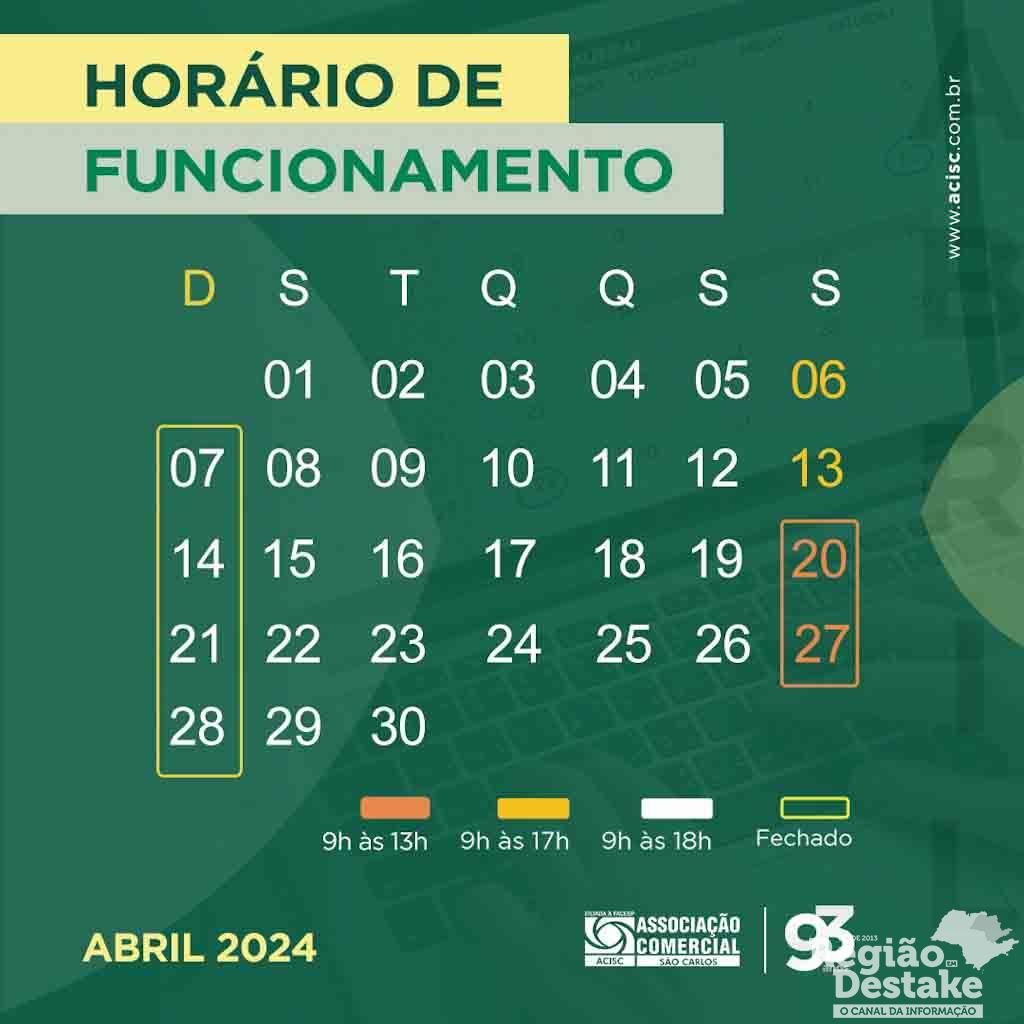 A ACISC (Associação Comercial e Industrial de São Carlos) divulgou nesta quarta-feira, 27 de março, o horário de funcionamento do comércio de rua (centro e bairros) para o mês de Abril de 2024.