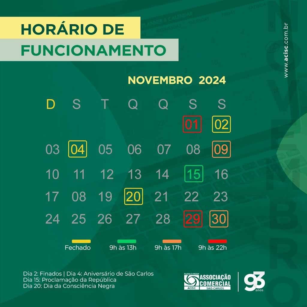 Confira também o horário do comércio de São Carlos (SP) em nossas redes sociais: @aciscsaocarlos.