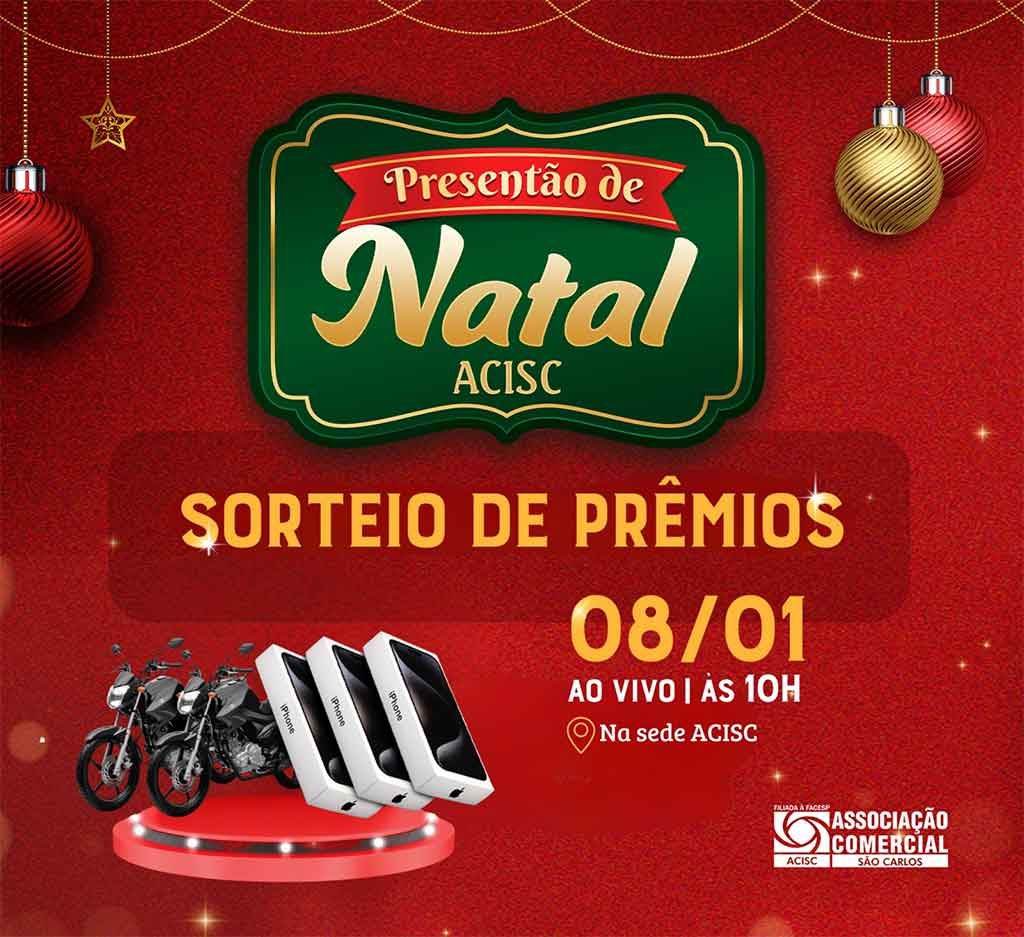 A Associação Comercial e Industrial de São Carlos (ACISC) realizará nesta quarta-feira, 08 de janeiro de 2025, o sorteio da campanha “Presentão de Natal ACISC”. Entre os prêmios, destacam-se 2 motos Yamaha Factor 125i 0km e 3 iPhones 15 de 128GB.