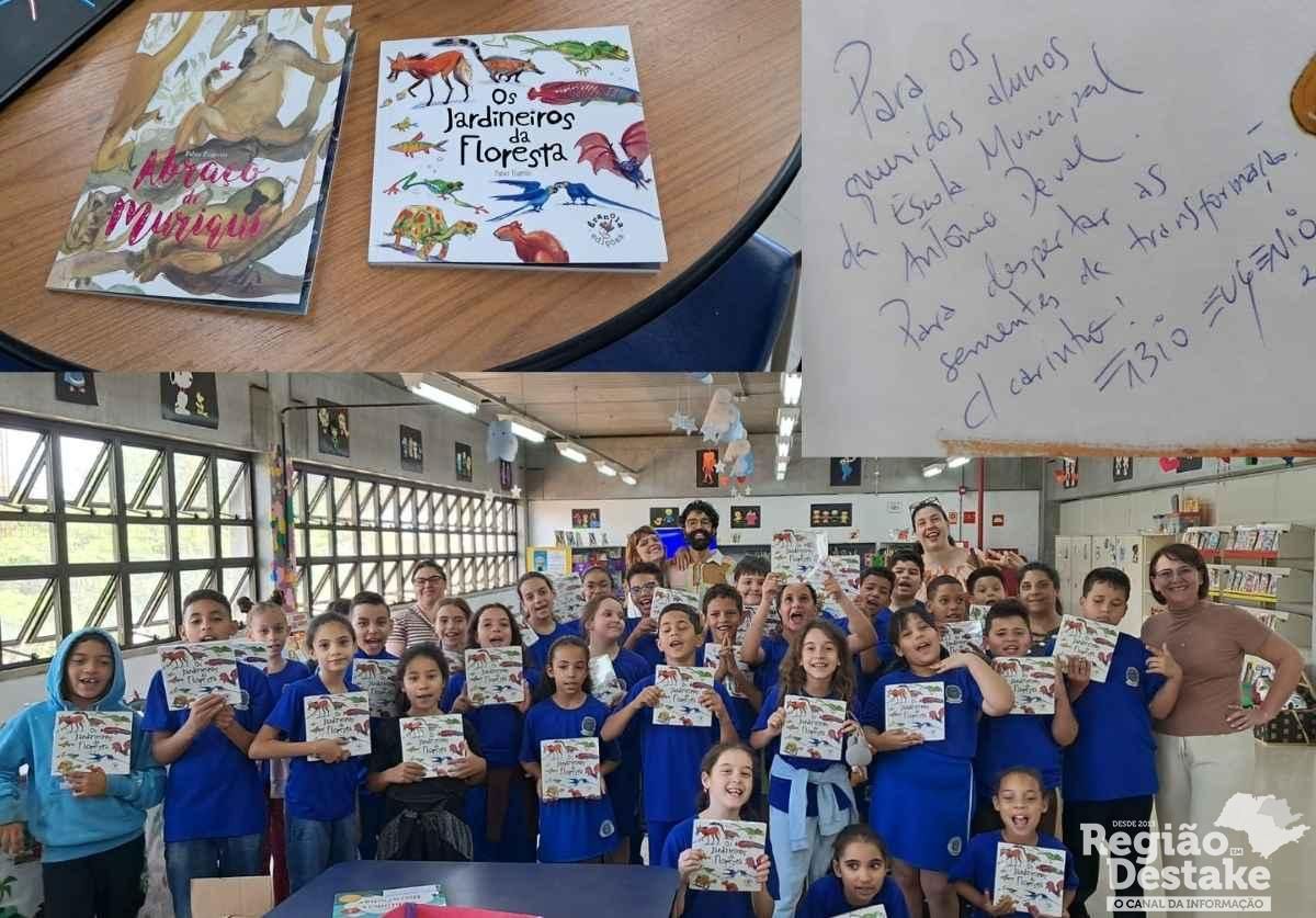Alunos do 4º ano da Escola Municipal Antônio Deval participaram de uma atividade cultural na Biblioteca Municipal que marcou o lançamento de duas obras infantis do escritor Fábio Eugênio. O encontro integrou estudantes ao universo do livro e aproximou a comunidade escolar do espaço público de leitura.