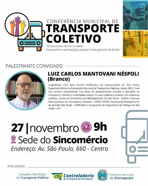 No próximo sábado (27), às 09h, a Prefeitura de Araraquara, por meio da Controladoria do Transporte de Araraquara e o Conselho Municipal do Transporte Público, promove a Conferência Municipal de Transporte Coletivo, que tem como tema “Democracia e direito à cidade: Transporte e a participação popular como garantia de direito”. O encontro é aberto ao público e será realizado na sede do Sincomércio, que fica na Av. São Paulo, 660, Centro.