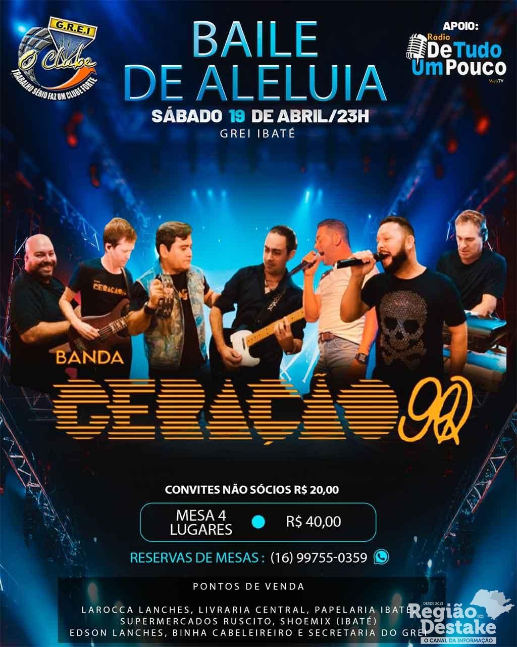 Ibaté se prepara para uma noite de música e diversão com o Baile de Aleluia, que será realizado no sábado, 19 de abril, a partir das 23h, no Grêmio Recreativo Esportivo Ibaté (GREI). O evento, promovido pelo GREI, contará com a apresentação da Banda Geração 90, conhecida por embalar o público com hits nostálgicos e muita energia.