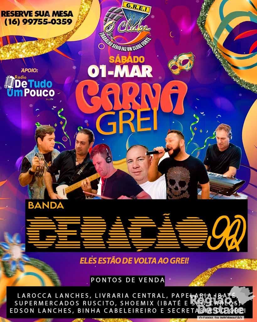 O Grêmio Recreativo Esportivo Ibaté (GREI) está trazendo de volta a renomada Banda Geração, que fez sucesso durante nos Carnavais dos anos 90 e 2000. Neste sábado, dia 1º de março, a banda se apresentará na sede social do clube, trazendo as tradicionais marchinhas, o contagiante axé e os maiores sucessos que prometem não deixar ninguém parado.