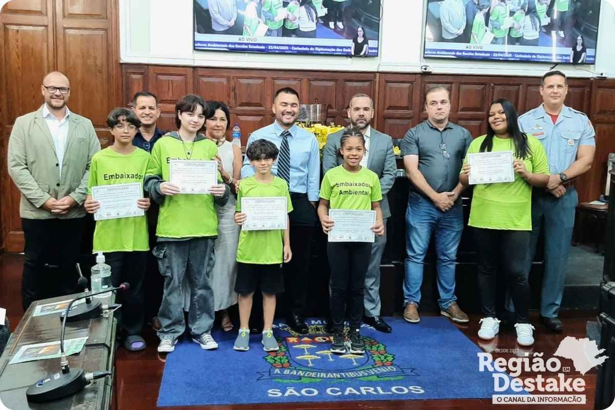 Em uma sessão solene realizada na manhã desta quinta-feira (23), a Câmara Municipal de São Carlos foi palco da diplomação de 92 novos “Embaixadores Ambientais”. O grupo é composto por estudantes de 46 escolas estaduais distribuídas por sete municípios da região, consolidando uma iniciativa de educação ambiental que completa sete anos de existência.