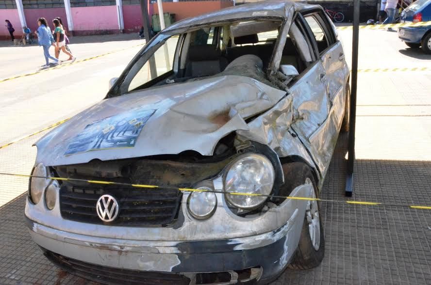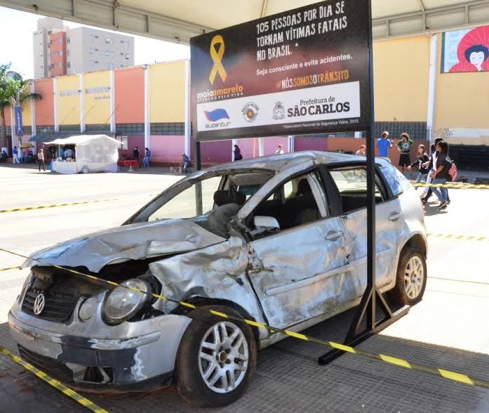 A imagem chama a atenção! O veículo, parcialmente destruído, integra a Campanha Maio Amarelo que tem como objetivo conscientizar a população dos altos índices de acidentes e mortes no trânsito. Em São Carlos, várias ações estão sendo desenvolvidas pela Secretaria de Transporte e Trânsito.