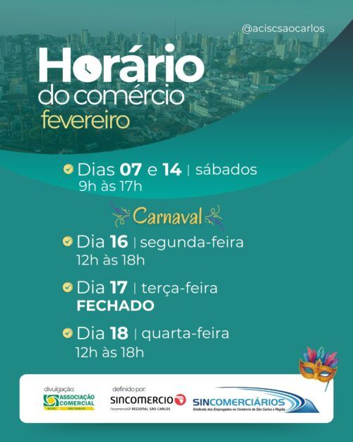 O comércio de São Carlos terá horários especiais de funcionamento ao longo do mês de fevereiro em razão do período de Carnaval. As regras seguem o que está previsto na convenção coletiva de trabalho, firmada entre os sindicatos que representam empregadores e empregados do setor.