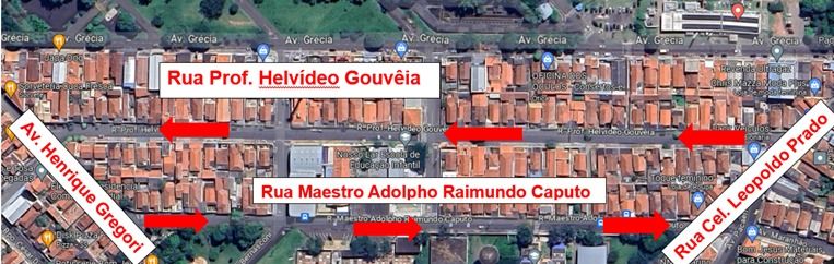 A rua Professor Helvídeo Gouvêia passará a ser mão única no sentido da rua Coronel Leopoldo Prado para a avenida Henrique Gregori. Já a rua Maestro Adolpho Raimundo Caputo passará a ser mão única no sentido da avenida Henrique Gregori para a rua Coronel Leopoldo Prado.