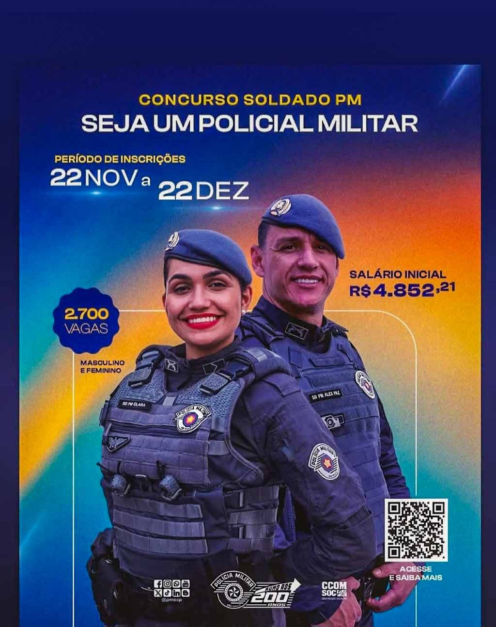 A Polícia Militar do Estado de São Paulo abriu as inscrições para o concurso público de Soldado PM de 2ª Classe. São oferecidas 2.700 vagas para candidatos do sexo masculino e feminino. O período de inscrições vai de 22 de novembro a 22 de dezembro de 2024.