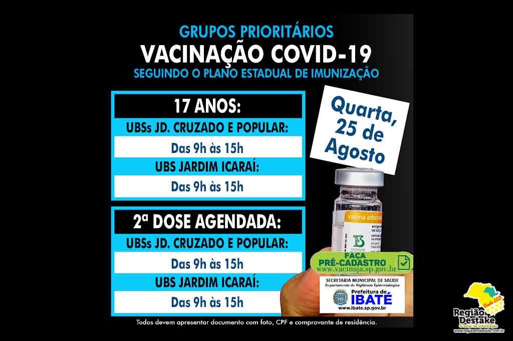 A Prefeitura de Ibaté, por meio da Secretaria Municipal da Saúde, informa que, seguindo o Plano Estadual de Imunização (PEI), inicia nesta quarta-feira, dia 25 de agosto, a vacinação contra a Covid-19, dos jovens com 17 anos completos sem comorbidades.