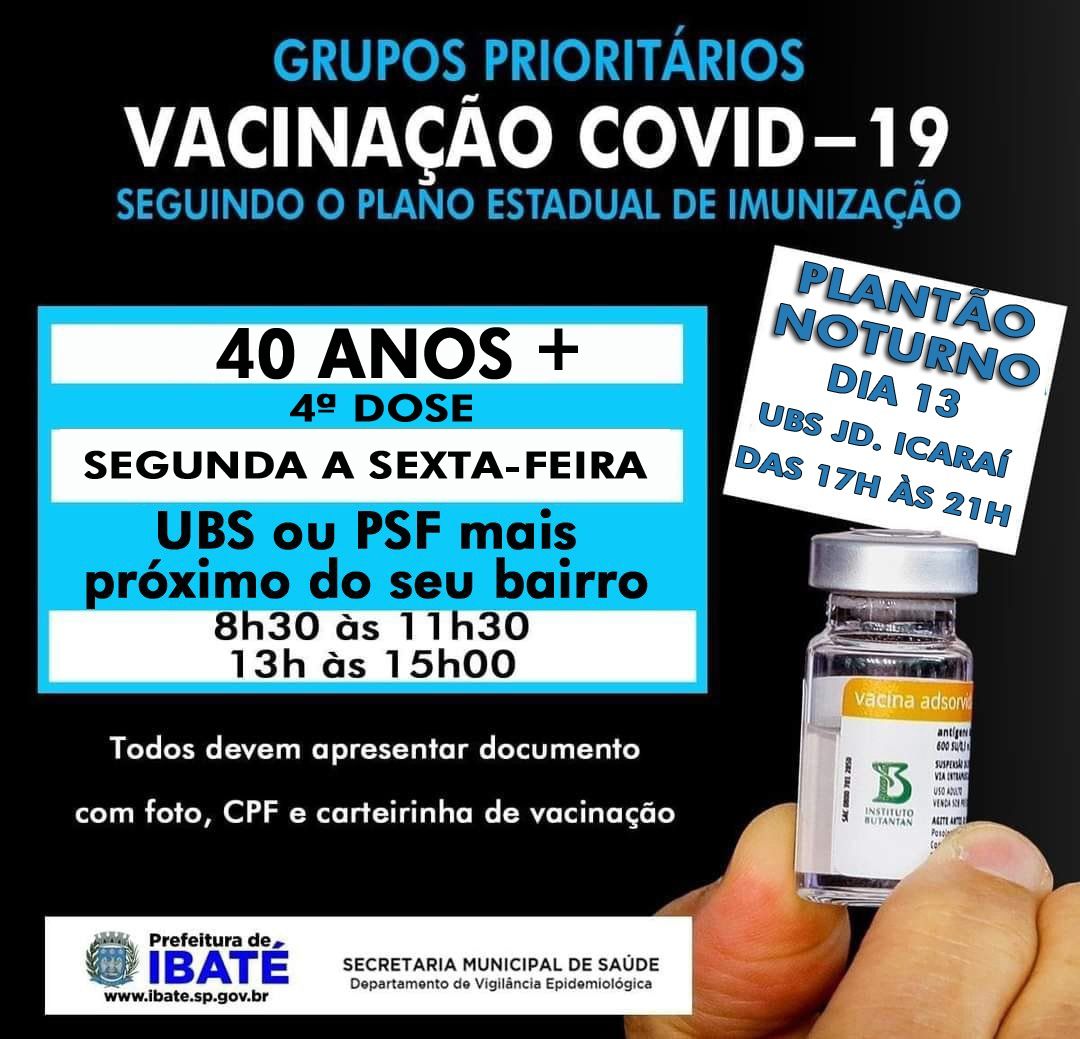 Dando continuidade a Vacinação contra a Covid-19, a Prefeitura de Ibaté, através da Secretaria Municipal de Saúde, realiza nesta quarta-feira, dia 13 de julho, mais um Plantão Noturno, para adultos e crianças, na Unidade Básica de Saúde (UBS) Jardim Icaraí.