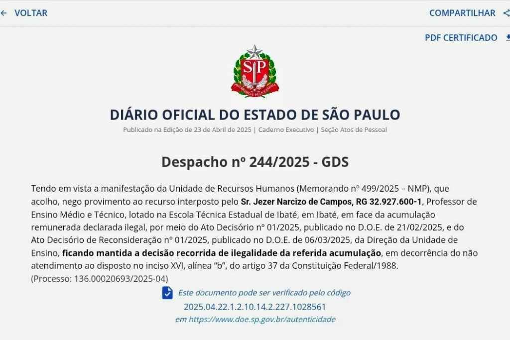 O caso foi tornado público no Diário Oficial do Estado de São Paulo desta quarta-feira, 23. Segundo o Governo do Estado, Jezer, nomeado na Prefeitura de Ibaté e também como professor na Escola Técnica Estadual da cidade, praticava acúmulo remunerado de cargos públicos — o que foi declarado ilegal com base no artigo 37 da Constituição Federal.