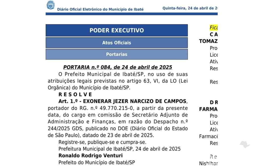 O prefeito de Ibaté, Ronaldo Venturi (PSD), exonerou nesta quinta-feira (24) o secretário adjunto de Administração e Finanças, Jezer Narcizo de Campos. A medida foi formalizada pela Portaria nº 084 e publicada no Diário Oficial do Município, com efeito imediato.