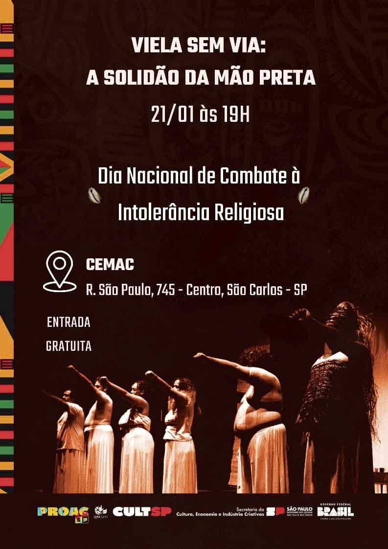 A Prefeitura de São Carlos, por meio das secretarias de Desenvolvimento Social e Cidadania e de Cultura e Turismo, em comemoração ao Dia Municipal de Combate à Intolerância Religiosa, 21 de janeiro, instituído pela instituído pela Lei Federal nº 11.635, de 2007 e em São Carlos pela Lei Municipal Nº 18.136, de autoria do então vereador Robertinho Mori, apresenta o espetáculo “Viela Sem Via – A Solidão da Mão Preta com o Coletivo BaobAfro.