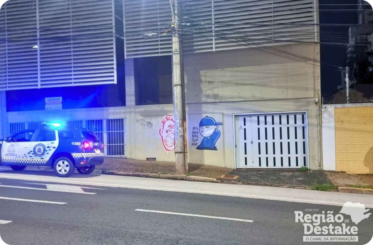 Dois homens foram flagrados pichando a parede de um prédio na noite de domingo (28), na Avenida São Carlos, região central do município.