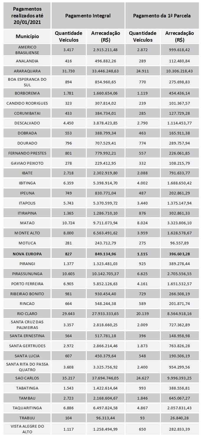 A Secretaria da Fazenda e Planejamento fechou balanço parcial do primeiro ciclo de pagamentos do Imposto sobre Propriedade de Veículos Automotores (IPVA) de 2021, em janeiro. Até o último dia do calendário de vencimentos, em 20/1, as 38 cidades que compõem parte do interior do Estado na região de Araraquara arrecadaram R$ 238.506.522,73, referentes ao pagamento à vista e à primeira parcela do imposto.