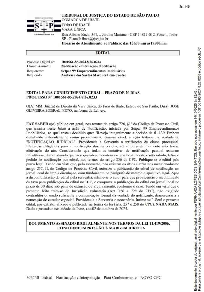 EDITAL PARA CONHECIMENTO GERAL – PRAZO DE 20 DIAS. PROCESSO Nº 1001561-85.2024.8.26.0233