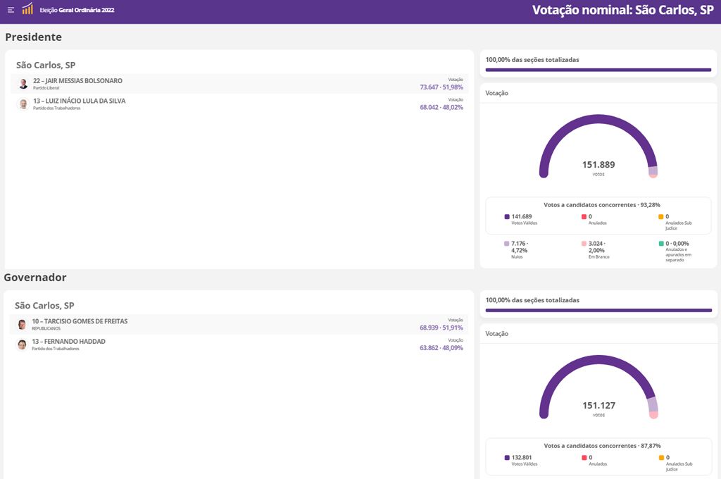 No primeiro turno, Bolsonaro (PL) alcançou 63.581 votos (44,98%) e Lula da Silva (PT) obteve 60.894 (43,08%). Tarcísio de Freitas (Republicanos) obteve 51.718 (41,11%) contra 48.302 votos de Fernando Haddad (38,39%).