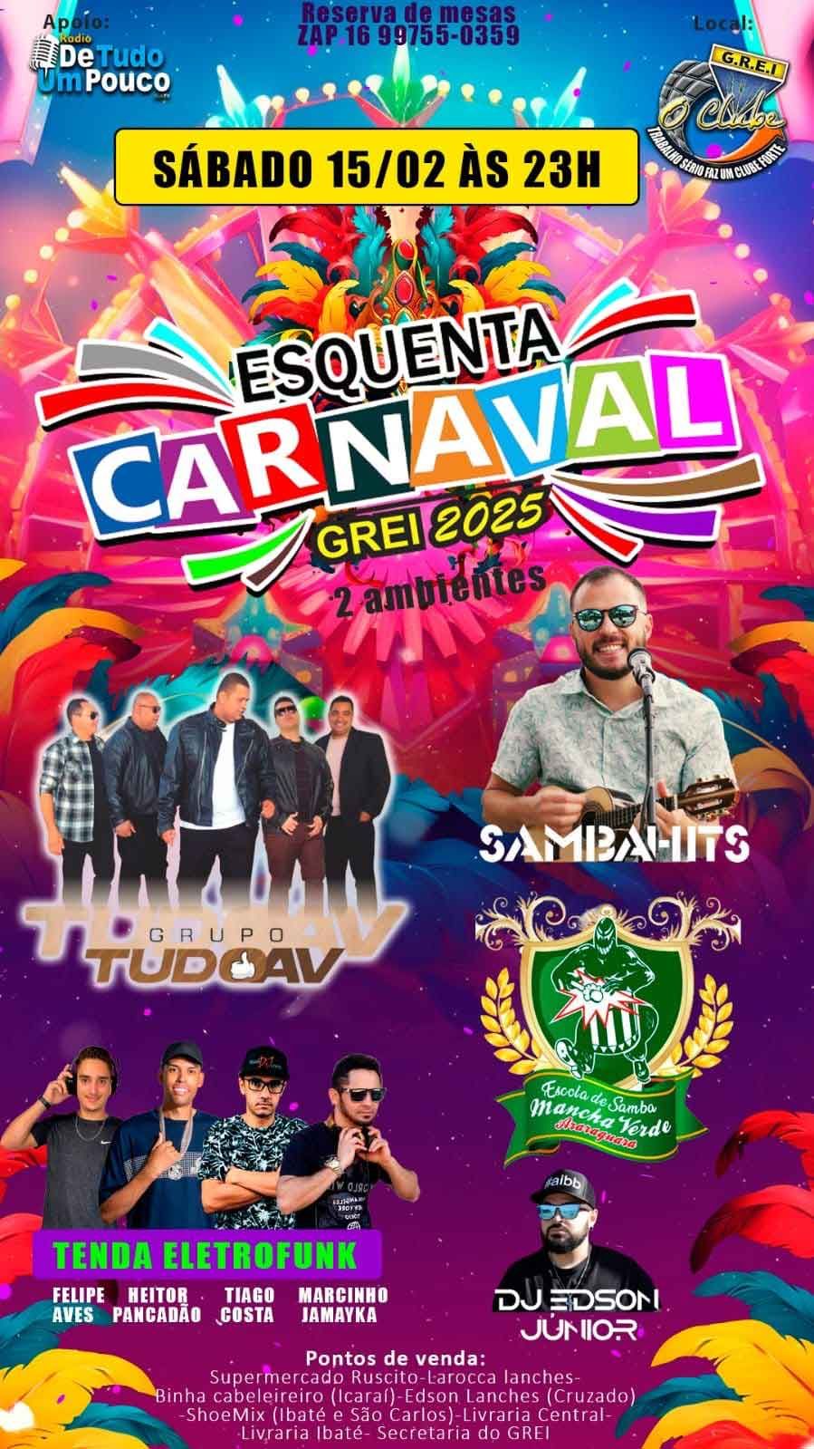O Grêmio Recreativo Esportivo Ibaté (GREI) abre suas portas neste sábado, 15, a partir das 23h, para o esperado “Esquenta Carnaval GREI 2025”. O evento promete movimentar a cidade com uma programação vibrante e repleta de atrações para todos os gostos.