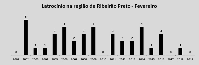 No segundo mês do ano, os indicadores de ocorrências e vítimas latrocínios passaram de um para zero na comparação com igual mês de 2018. É a quarta vez que os índices ficam zerados na série histórica, iniciada em 2001.