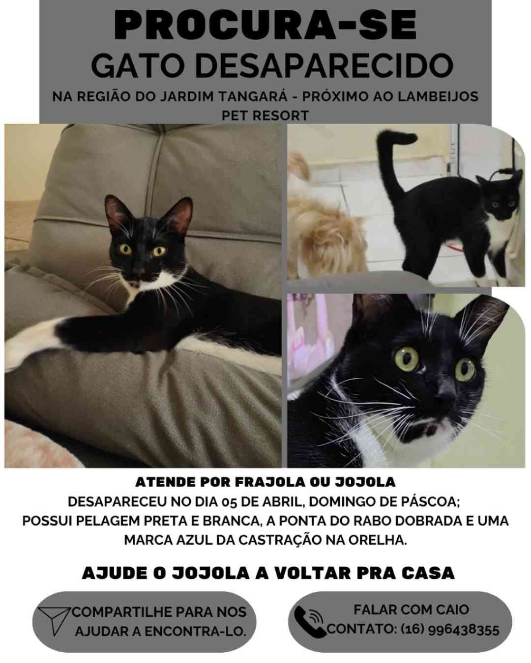 Quem tiver qualquer informação sobre o paradeiro de Frajola, ou Jojola, pode entrar em contato com Caio pelo telefone (16) 99643-8355. A orientação é para que moradores da região do Jardim Tangará redobrem a atenção e compartilhem a informação, aumentando as chances de o animal voltar para casa.