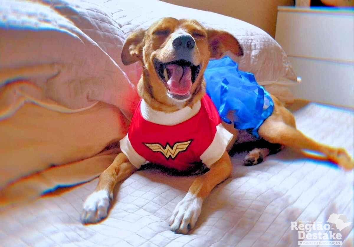 A cadela é uma vira-lata caramelo, tem as quatro patinhas brancas e está sem coleira.