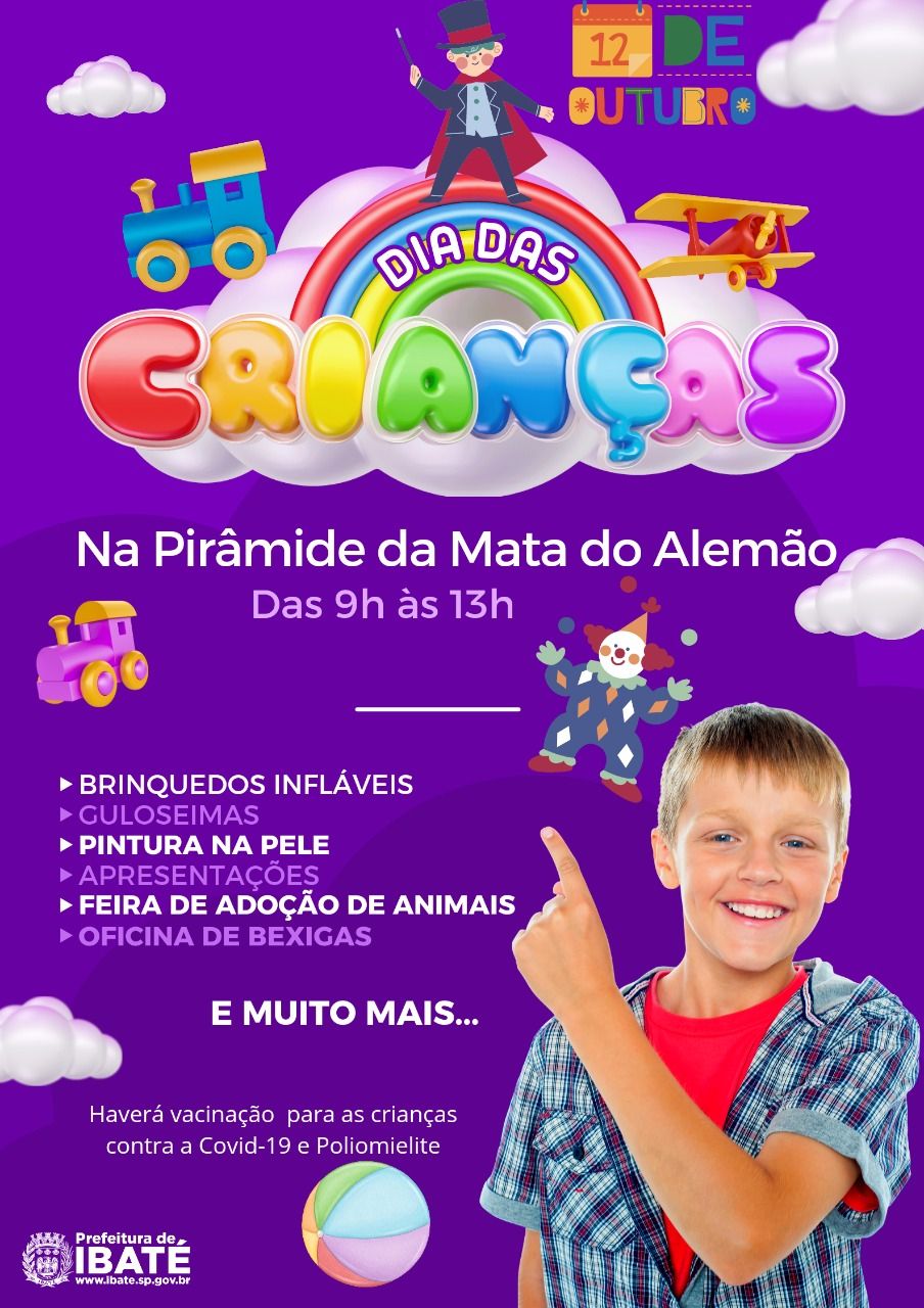 A Prefeitura de Ibaté, através da Secretaria Municipal de Educação e Cultura, realiza nesta quarta-feira dia 12 de outubro, das 9h às 13h, a tradicional Festa do Dia das Crianças. O evento será realizado no Espaço Multidisciplinar Pirâmide Mata do Alemão, com entrada gratuita, contará com a distribuição gratuita cachorro quente, pipoca, algodão doce, suco e sorvete.