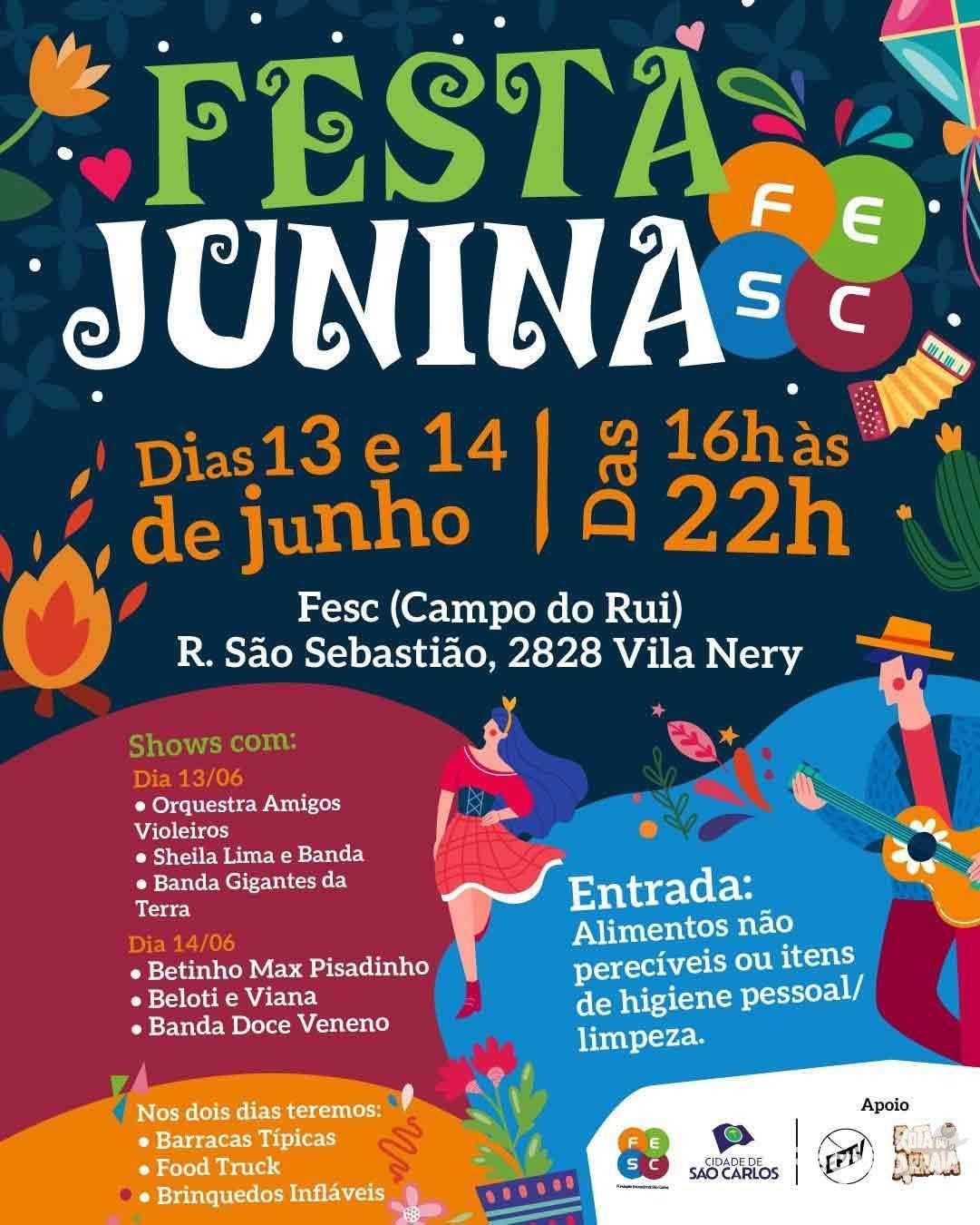 A Fundação Educacional São Carlos (Fesc) promove, nesta sexta-feira (13) e sábado (14), sua tradicional festa junina no campo do Rui Barbosa, localizado na Rua São Sebastião, 2828, na Vila Nery. O evento terá entrada solidária, mediante a doação de alimentos não perecíveis ou itens de higiene e limpeza.
