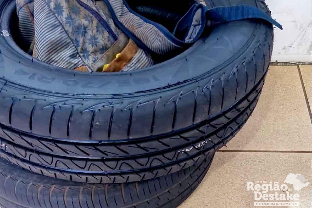 Durante o patrulhamento de rotina, os agentes avistaram um homem de 31 anos carregando dois pneus que aparentavam estar em bom estado de conservação. Ao ser abordado, o indivíduo alegou que havia recebido os pneus como presente. No entanto, a equipe desconfiou da versão, principalmente porque um dos pneus parecia novo.
