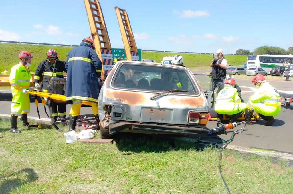 O exercício envolveu três veículos, sendo dois pesados. Pela dinâmica, um automóvel de passeio bate em uma carreta transportando substância inflamável. Para elevar a complexidade dos trabalhos operacionais, o “acidente” ocorreu em uma alça de retorno do dispositivo. O automóvel, desgovernado, cruzou o gramado e colidiu com um caminhão vazio que acessava a alça.