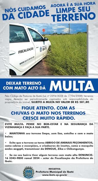 Para orientar a população, a prefeitura distribuiu panfletos da campanha “Nós Cuidamos da Cidade. Agora é a Sua Hora Limpe Seu Terreno”, durante o mês de fevereiro. Nele, o cidadão é lembrado que deixar terreno com mato alto dá multa. “Fique atento. Com as chuvas, o mato nos terrenos cresce muito rápido. Pense no bem-estar e na segurança da vizinhança e faça a sua parte”.