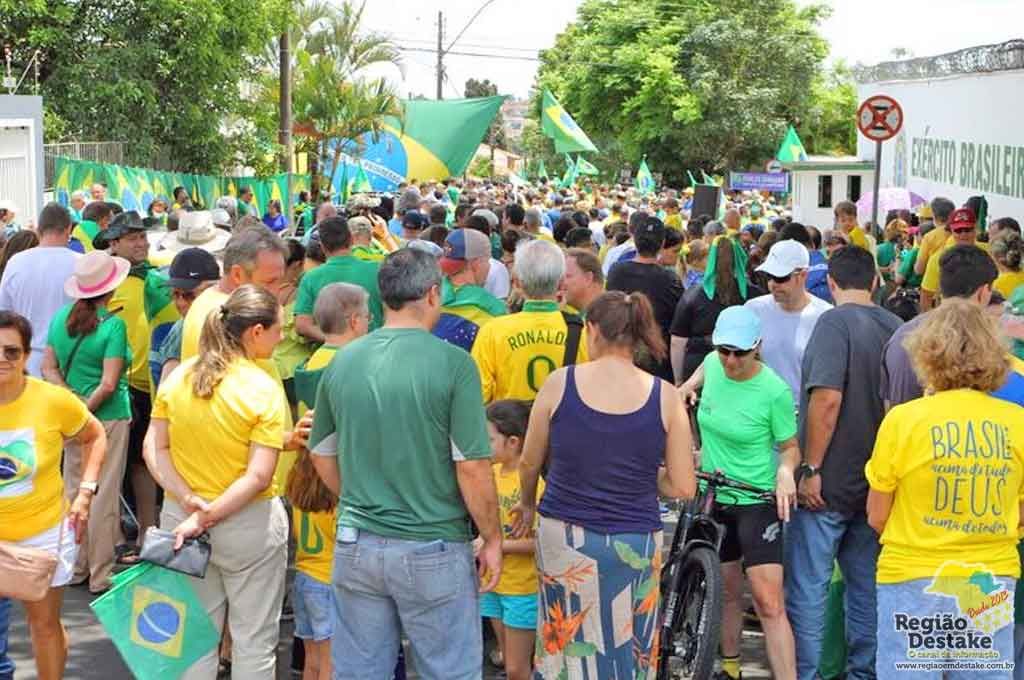 Em São Carlos, centenas de pessoas se reúnem em frente ao quartel do Tiro de Guerra com bandeiras brasileiras e cartazes. Há ainda um trio elétrico e uma imagem de Nossa Senhora Aparecida.