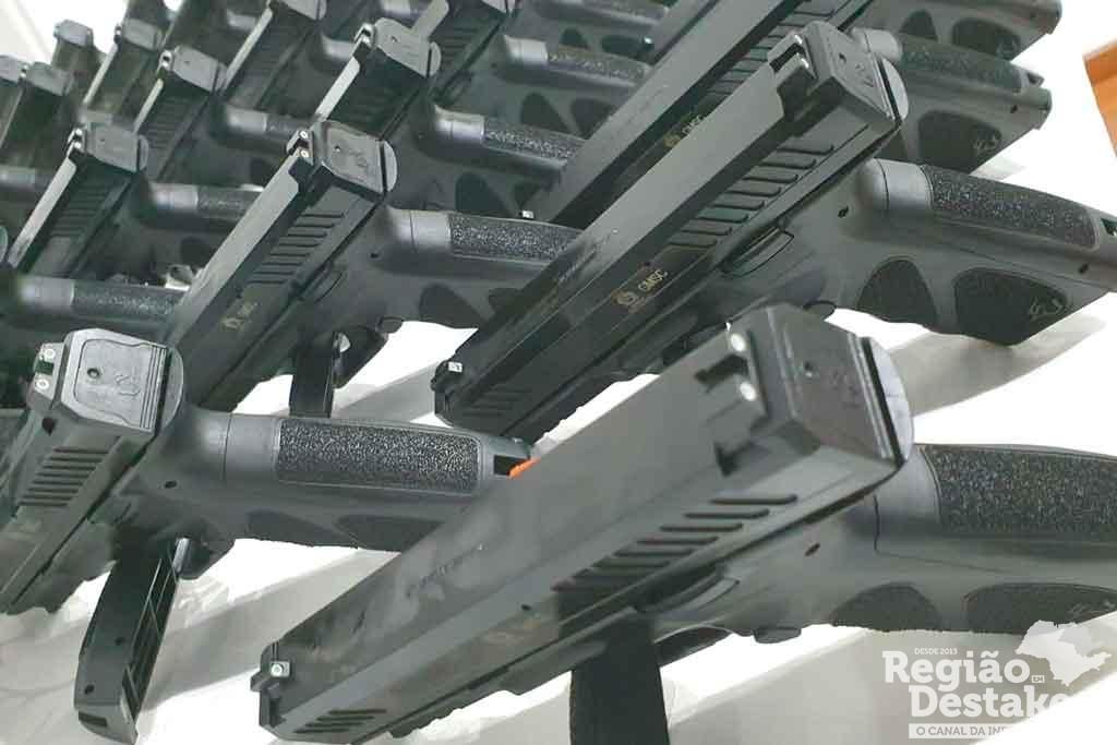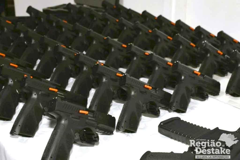 As armas foram entregues pelo secretário de Segurança do Estado, Guilherme Derrite, e pelo delegado geral da Polícia Civil, Artur José Dian