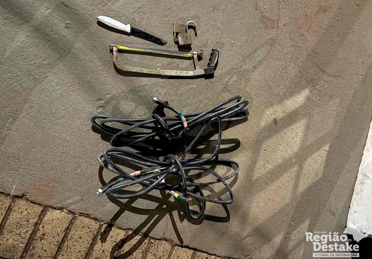 No local, os agentes encontraram dois homens, de 47 e de 59 anos, empurrando uma carriola que continha cabos, uma serra, uma faca e dois cadeados quebrados — indícios de que o material teria sido cortado e subtraído do interior da instalação.
