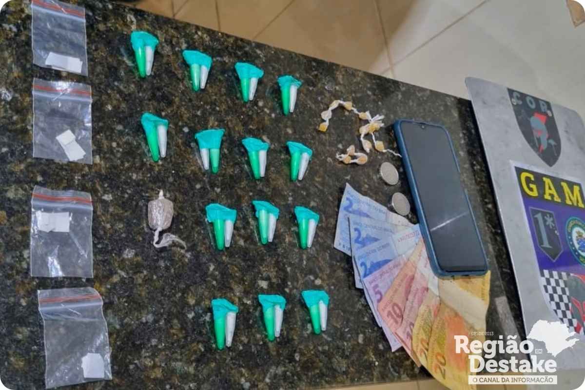 Durante a revista, os agentes localizaram com uma adolescente de 15 anos uma quantidade significativa de drogas, incluindo 26 eppendorfs, uma porção de maconha, quatro papelotes de substância conhecida como ICE, 13 pedras de crack e R$ 72 em dinheiro trocado.