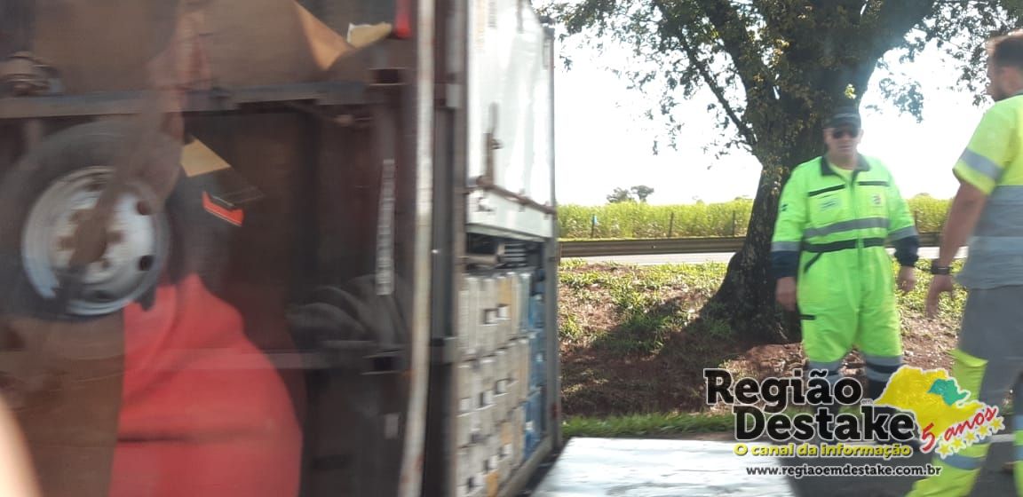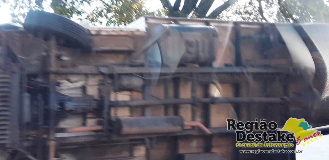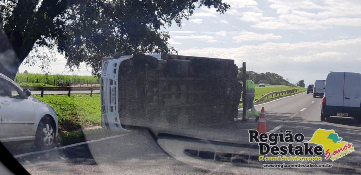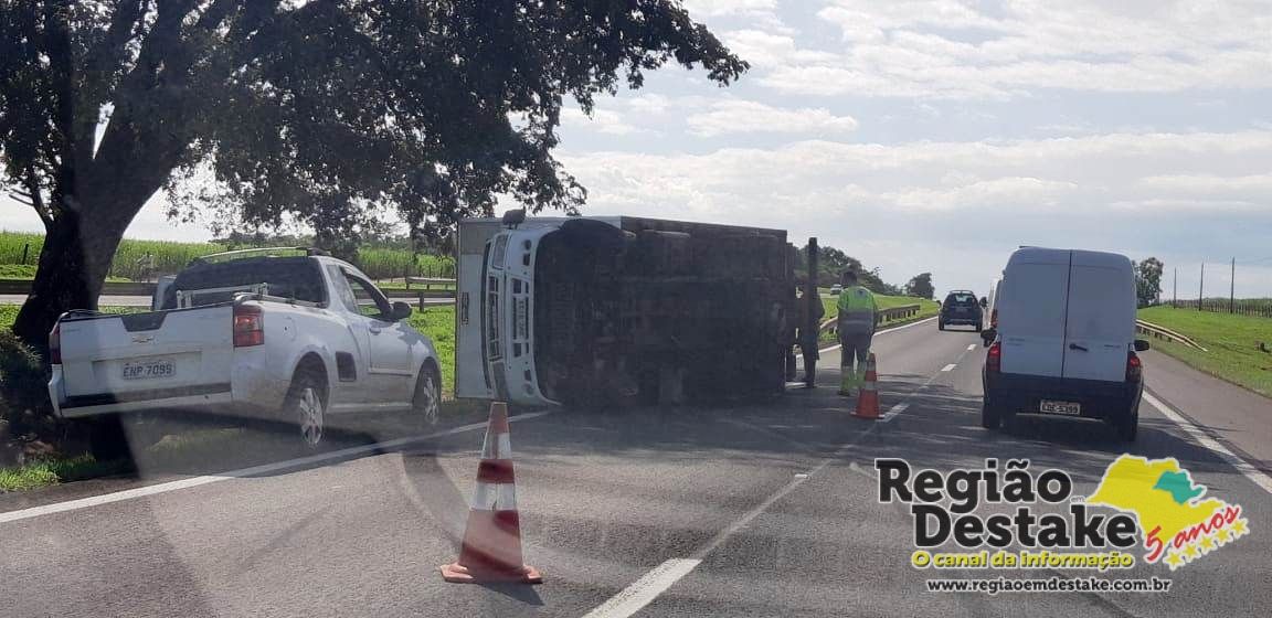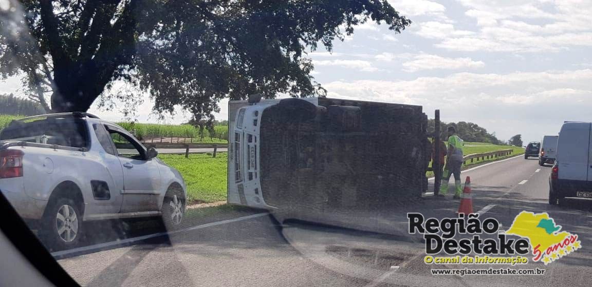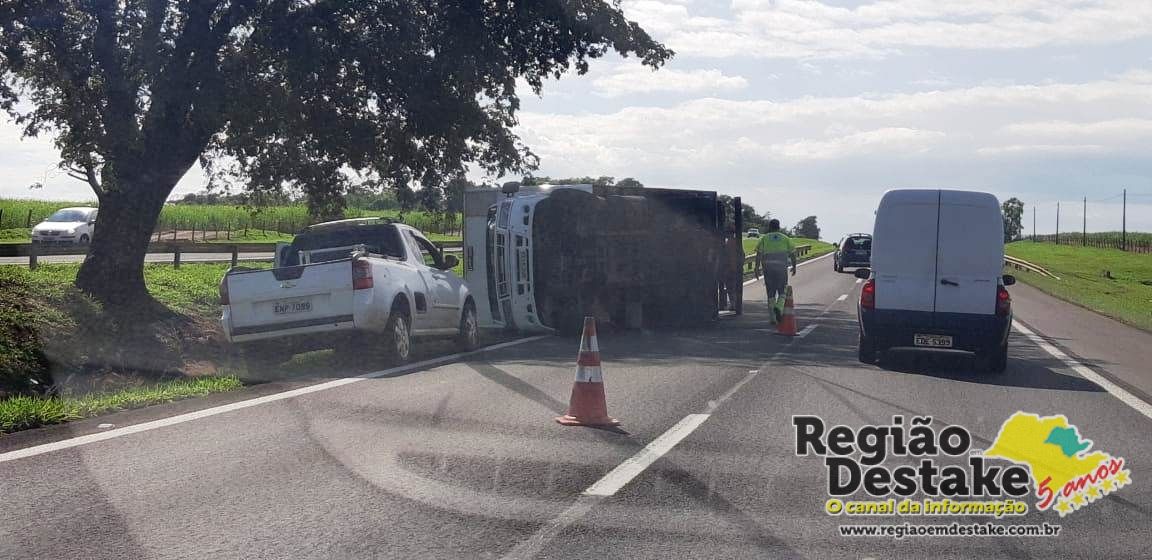 Um caminhão tombou, agora pouco, próximo ao quilômetro 243 da rodovia Washington Luis (SP-310), na descida do Posto Nosso Senhora de Fátima, em Ibaté.