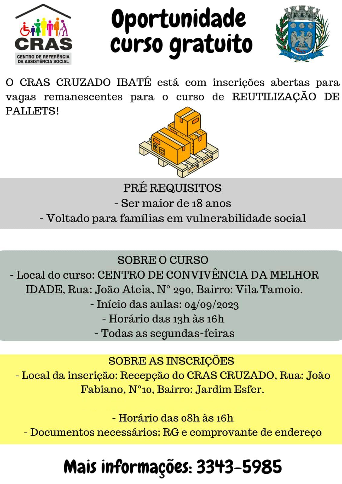 O Centro de Referência de Assistência Social de Ibaté – CRAS Cruzado, por meio da Secretaria de Promoção e Bem Estar Social, iniciou inscrições para o curso de Reutilização de Pallets.