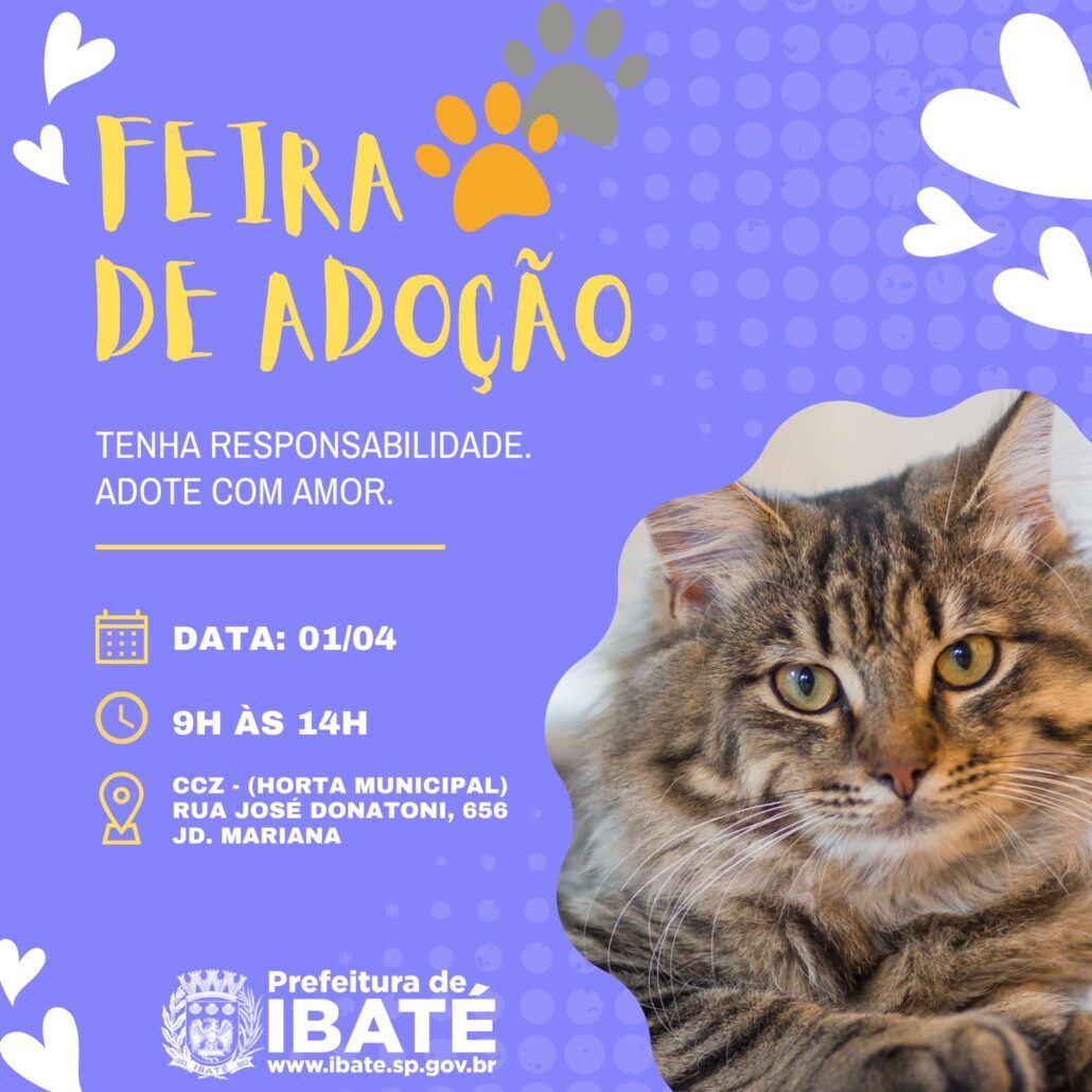 O Centro de Controle de Zoonoses (CCZ) “João Trevizan”, realiza uma feira de adoção, neste sábado (01), das 9h às 14h, com o objetivo de aumentar a adoção consciente de animais na cidade de Ibaté.