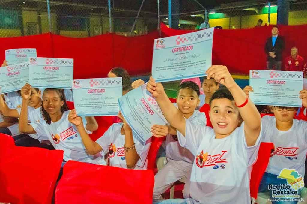 Cerca de 136 alunos do 5º ano, da escola Brasilina Teixeira Ianoni, da rede municipal de ensino participaram da cerimônia de formatura do Programa Educacional de Resistência às Drogas (Proerd), desenvolvido pela Polícia Militar e que conta com apoio da Secretaria Municipal da Educação. O evento ocorreu nesta sexta-feira, 30 de junho, nas dependências da escola.
