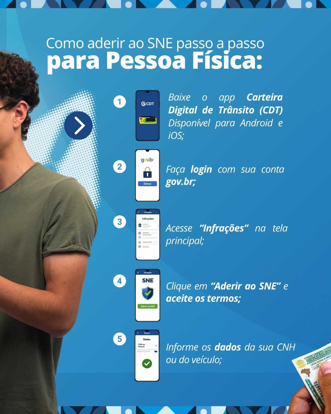 O processo de adesão é rápido e pode ser realizado em poucos passos. Após baixar o aplicativo Carteira Digital de Trânsito, o condutor deve acessar a plataforma com sua conta gov.br, entrar na opção “Infrações” e selecionar a funcionalidade de adesão ao SNE. Em seguida, basta aceitar os termos do sistema e informar os dados da Carteira Nacional de Habilitação ou do veículo. Outro recurso disponível é a possibilidade de indicar o real condutor diretamente pelo aplicativo, o que amplia a praticidade do serviço.
