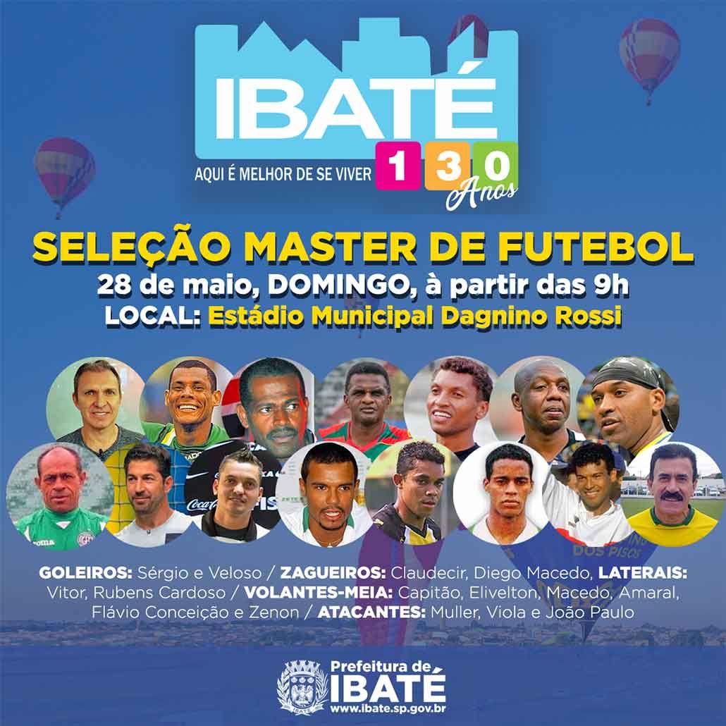 No próximo domingo, dia 28 de maio, acontece a emocionante partida entre a Seleção Master de Futebol que contará com a presença de jogadores consagrados de diversos times da elite nacional, com participações na Seleção Brasileira e também passagens de sucesso fora do país – e a Seleção de Ibaté.