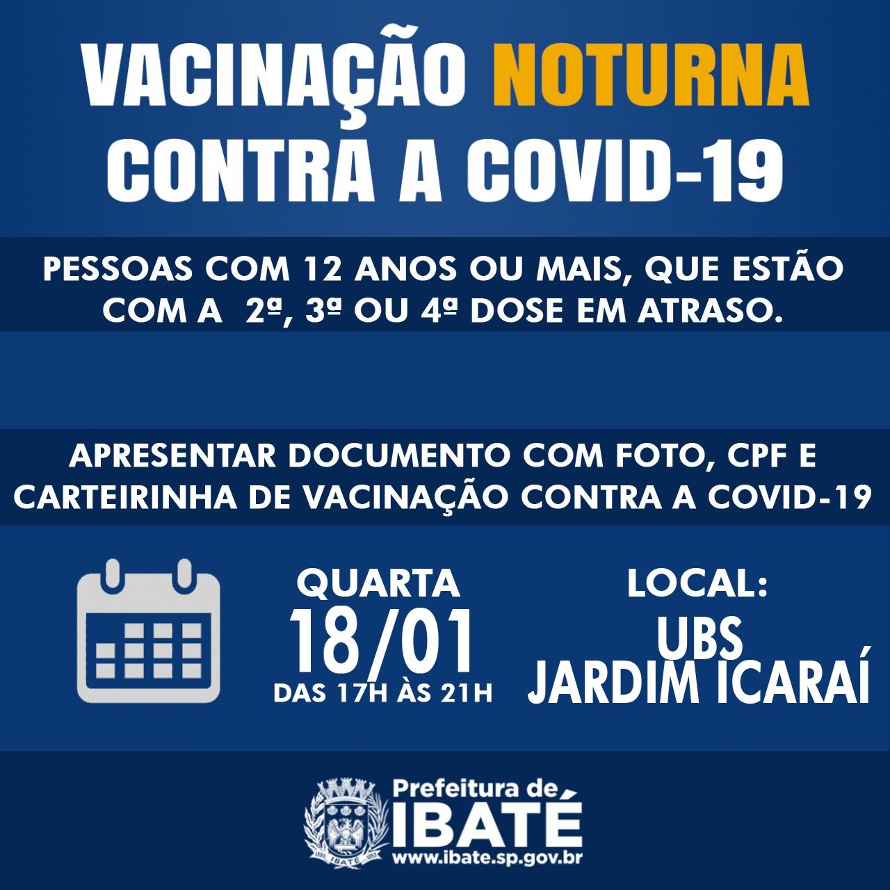 Em virtude do número de faltosos, a Secretaria Municipal de Saúde de Ibaté, por meio da Vigilância Epidemiológica, disponibiliza mais um Plantão Noturno de Vacinação contra a Covid-19, nesta quarta-feira (18), exclusivamente, na Unidade Básica de Saúde (UBS) Jardim Icaraí, das 17h às 21h.