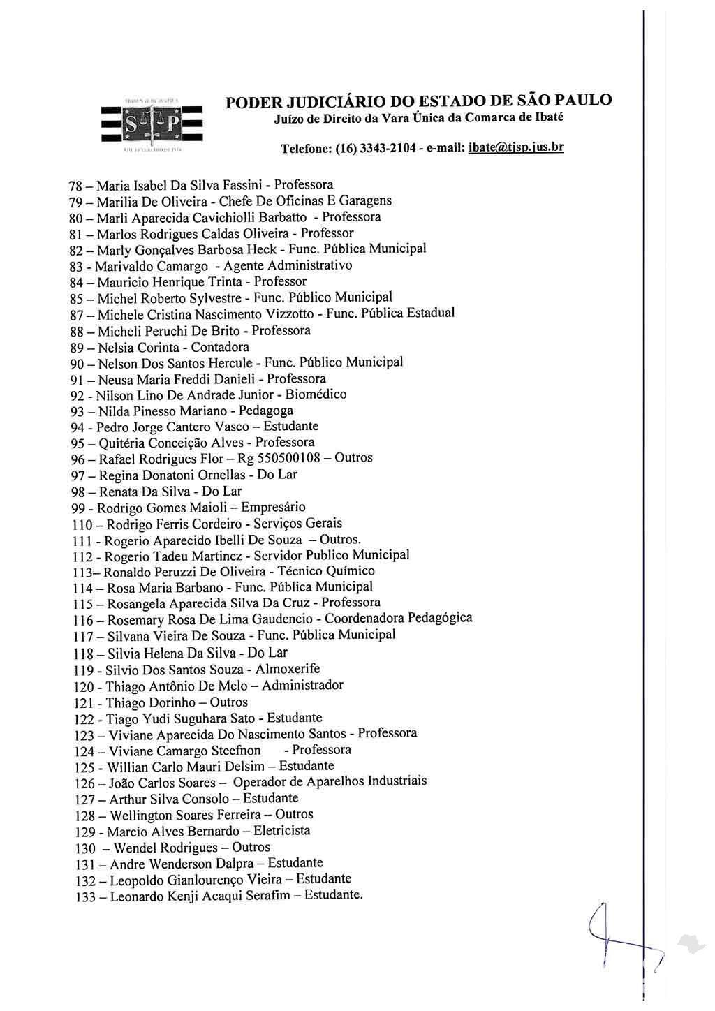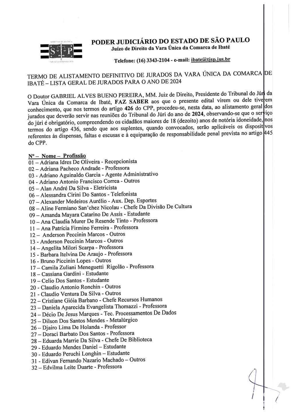 O Poder Judiciário de Ibaté divulgou a Lista Geral de Jurados para o ano de 2024. O Termo de Alistamento Definitivo de Jurados da Vara Única da Comarca de Ibaté foi divulgado pelo Jornal Folha de Ibaté.