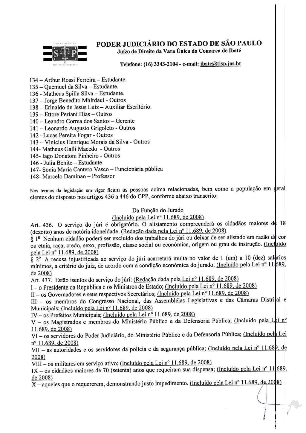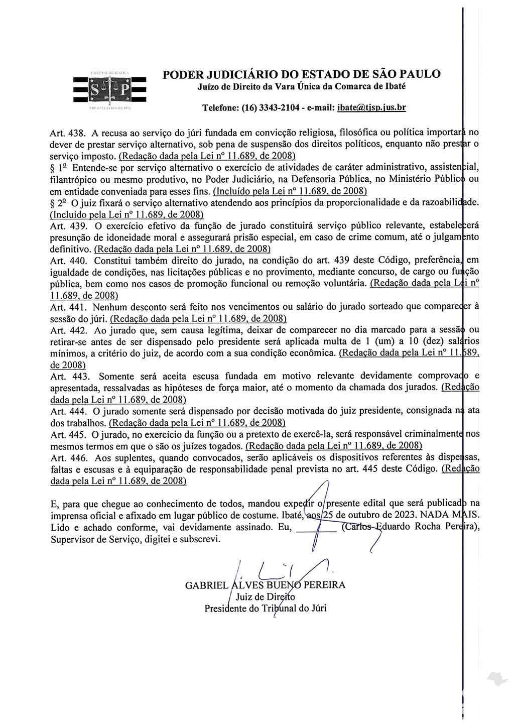 De acordo com o documento os jurados deverão servir nas reuniões do Tribunal do Júri do ano de 2024, observando-se que o serviço do júri é obrigatório, compreendendo os cidadãos maiores de 18 anos de notória idoneidade, nos termos do artigo 436, sendo que aos suplentes, quando convocados, serão aplicáveis os dispositivos referentes às dispensas, faltas e escusas e à equiparação de responsabilidade penal prevista no artigo 445, do CPP.