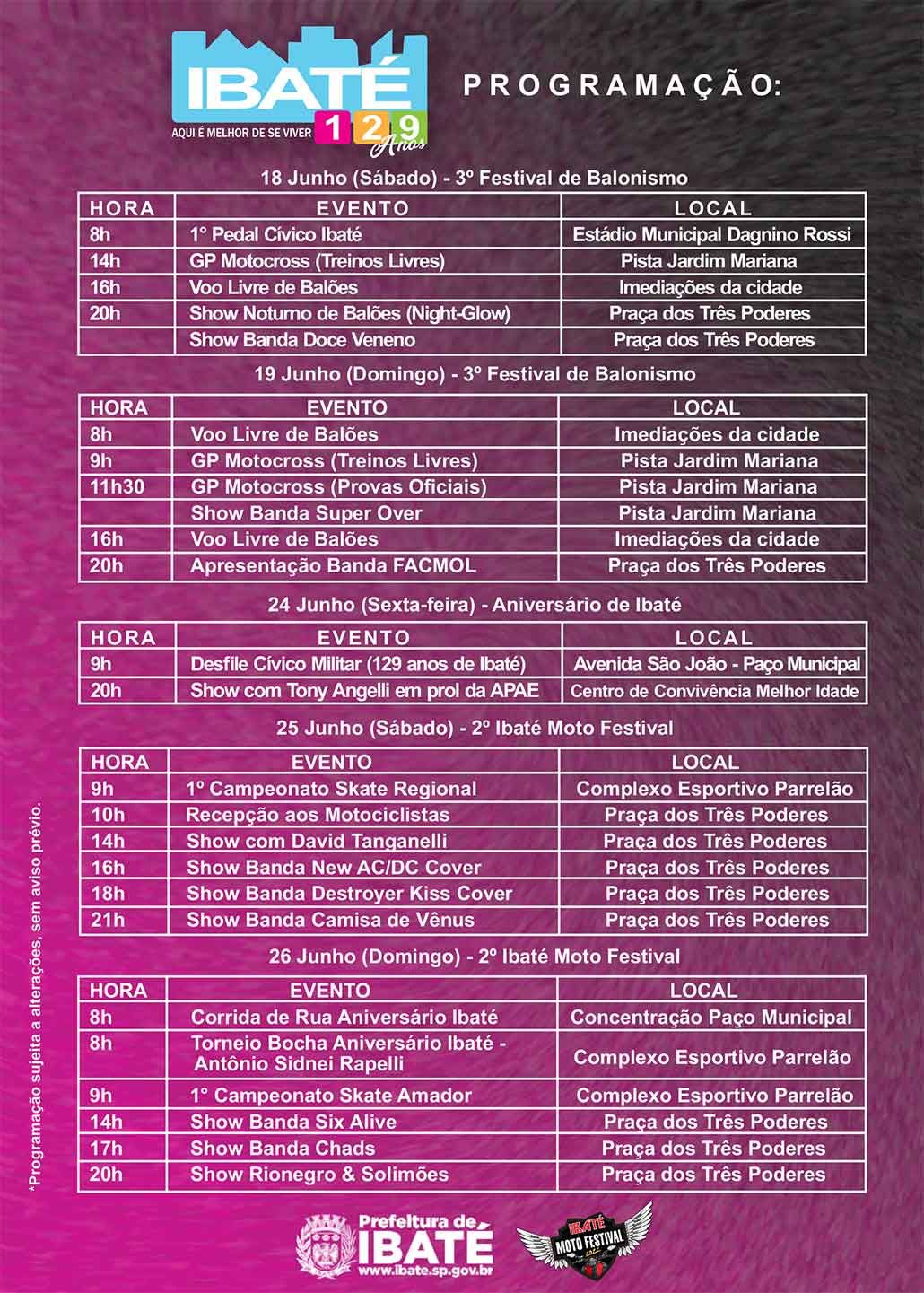 Marcando o retorno dos eventos na cidade, a Prefeitura Municipal divulgou nesta sexta-feira, 03 de junho, a programação das festividades em comemoração aos 129 anos de Ibaté. Os eventos serão realizados entre os dias 18 e 26 de junho.