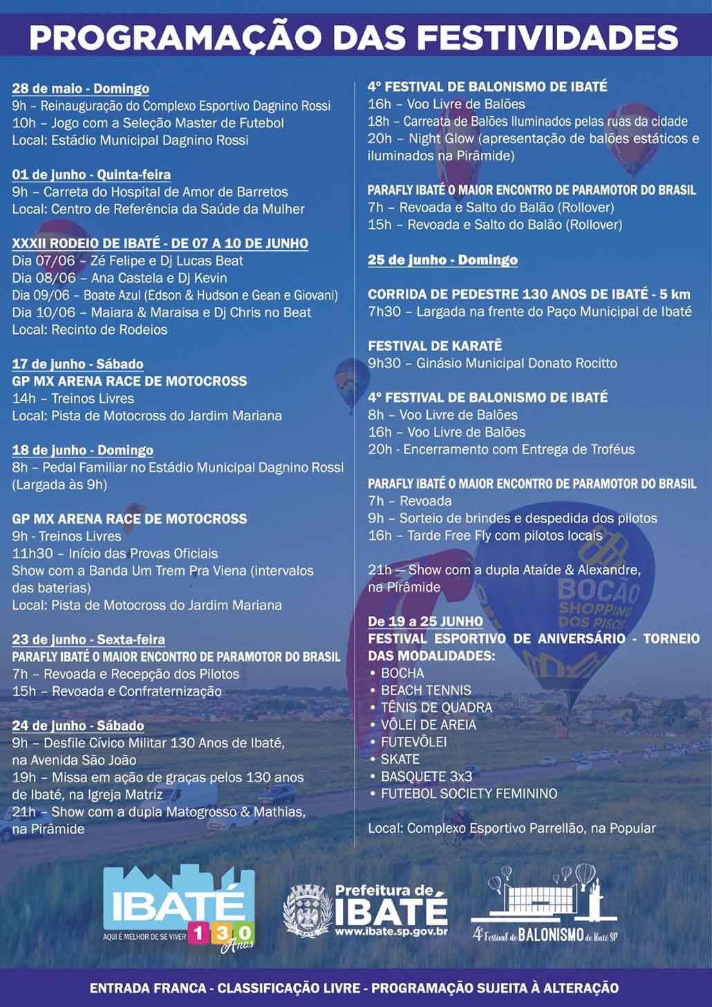 A Prefeitura Municipal divulgou nesta terça-feira, 17 de maio, a programação das Festividades dos 130 anos de Ibaté. Os eventos serão realizados entre os dias 28 de maio e 25 de junho.